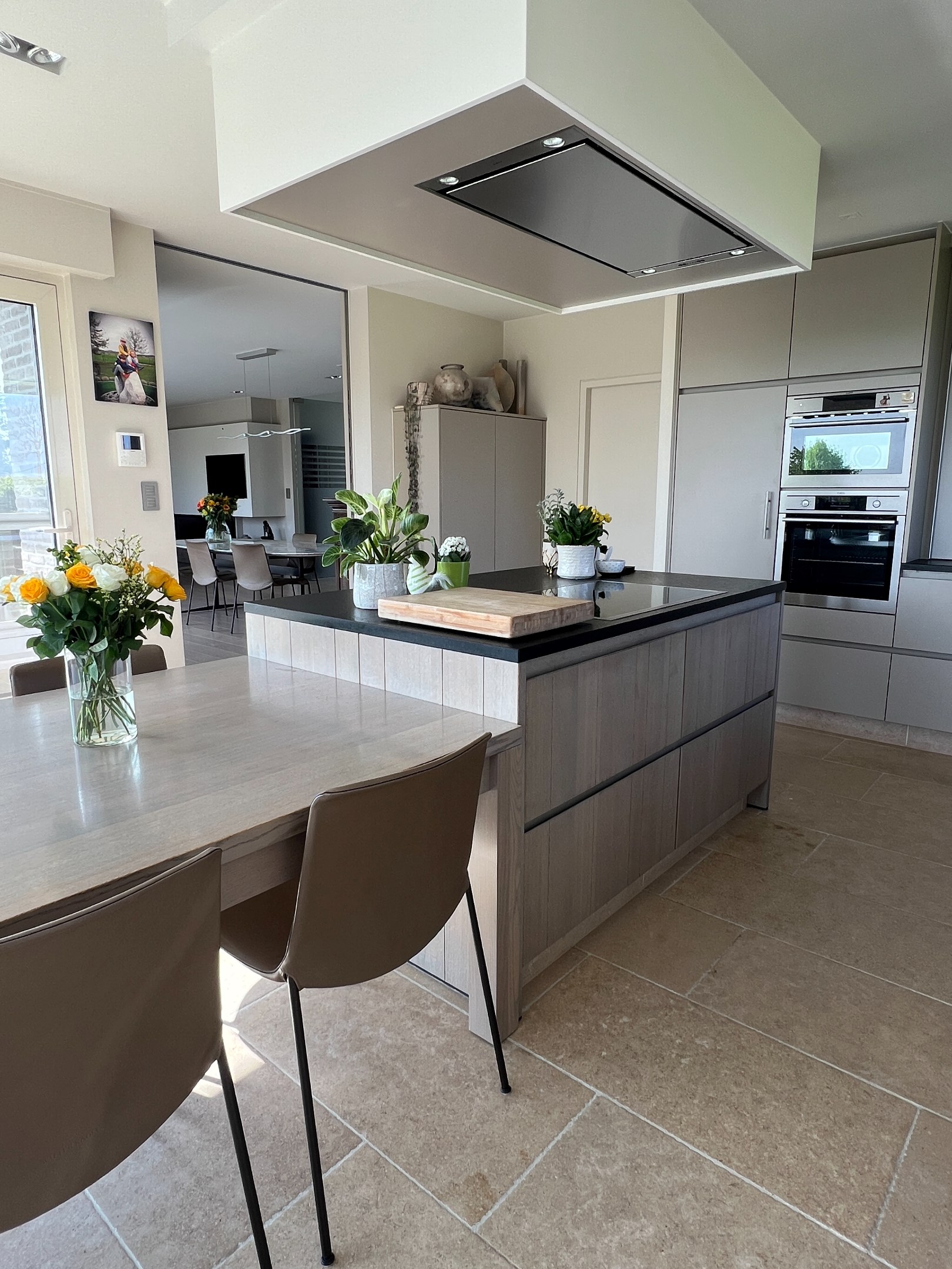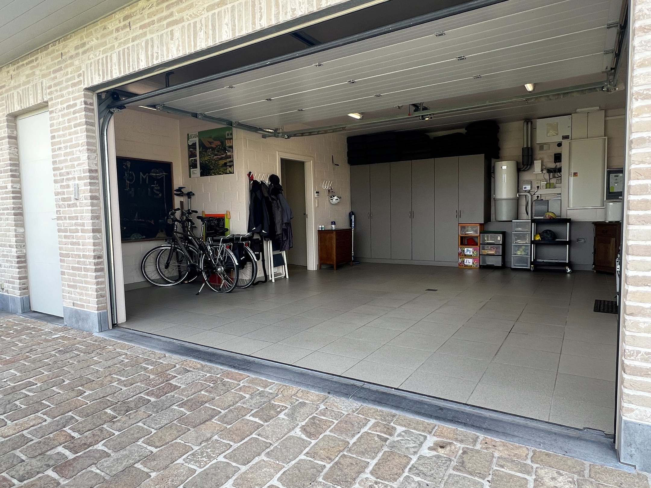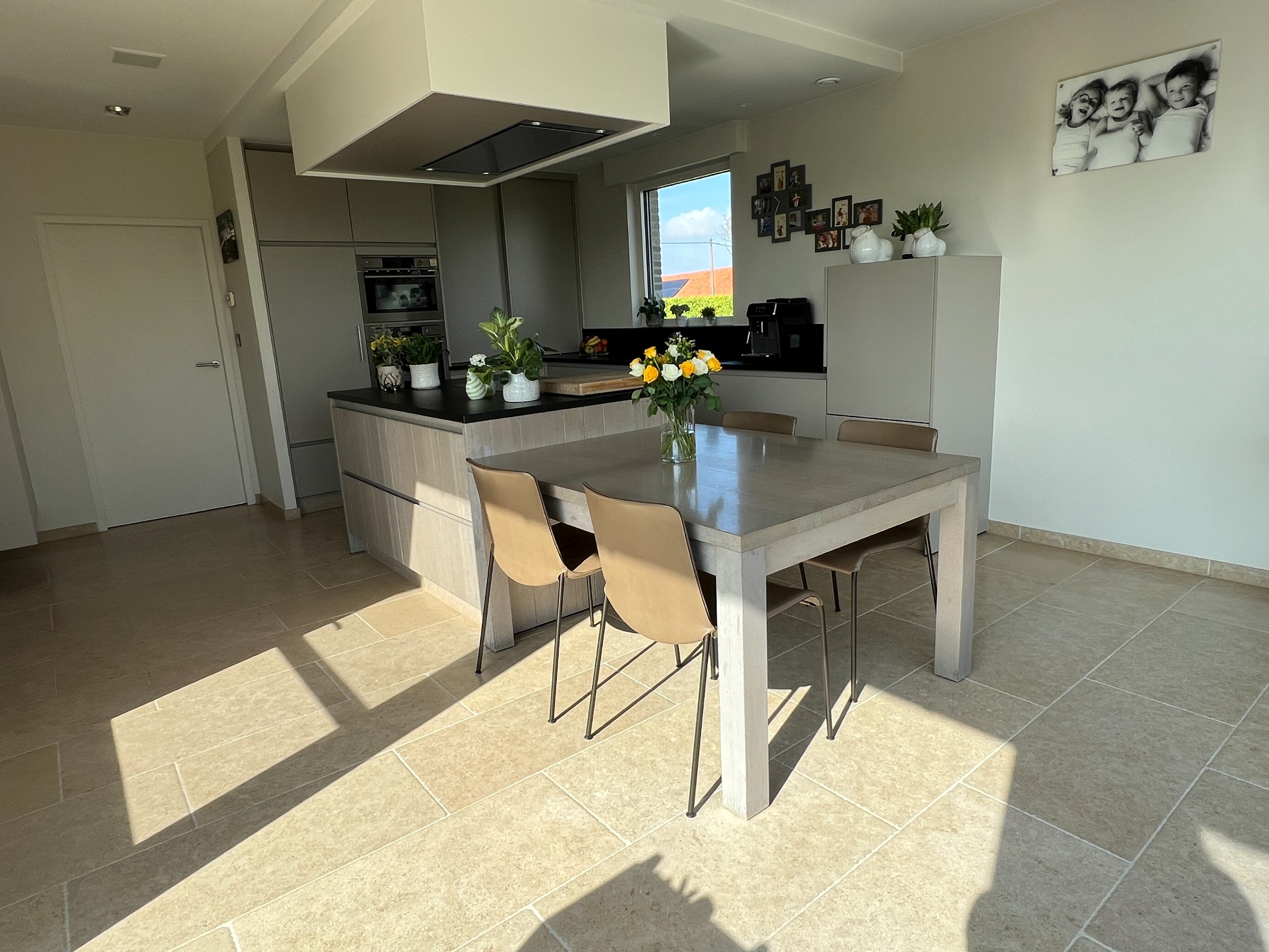 Aan de andere zijde van de woonkamer vindt u de volledig uitgeruste keuken, compleet met eiland en een gezellige ontbijthoek. Tussen deze lichtrijke leefkeuken en de ruime inpandige garage bevindt zich een praktische bijkeuken, met een voorraadkamer, wasplaats, en toegang tot de kelder. De ruime en multifunctionele kelder is bovendien gemakkelijk bereikbaar zonder trap, wat ideaal is voor directe toegang tot de achtertuin.