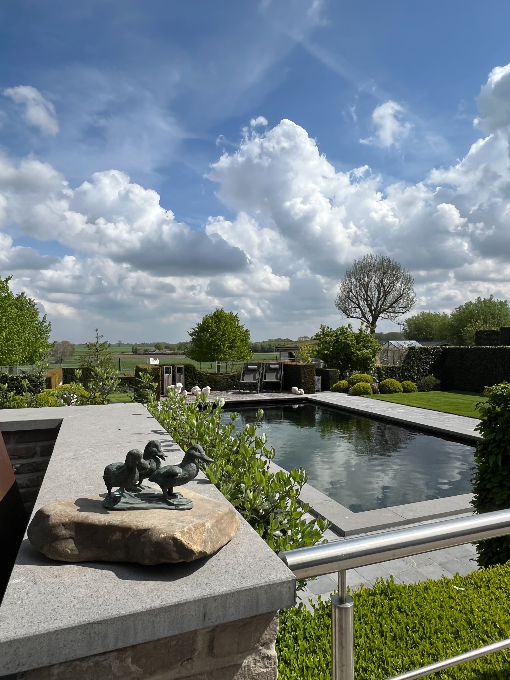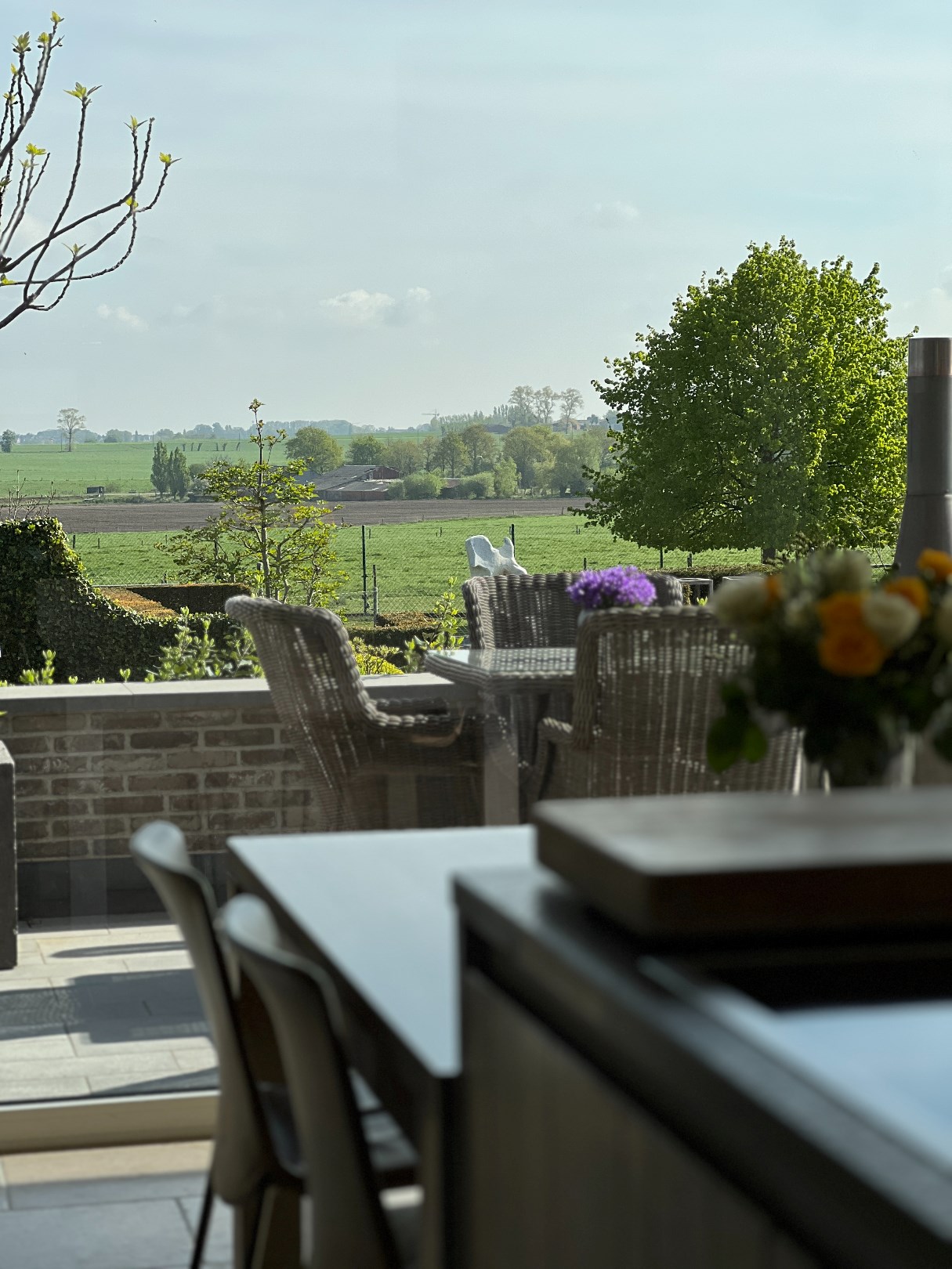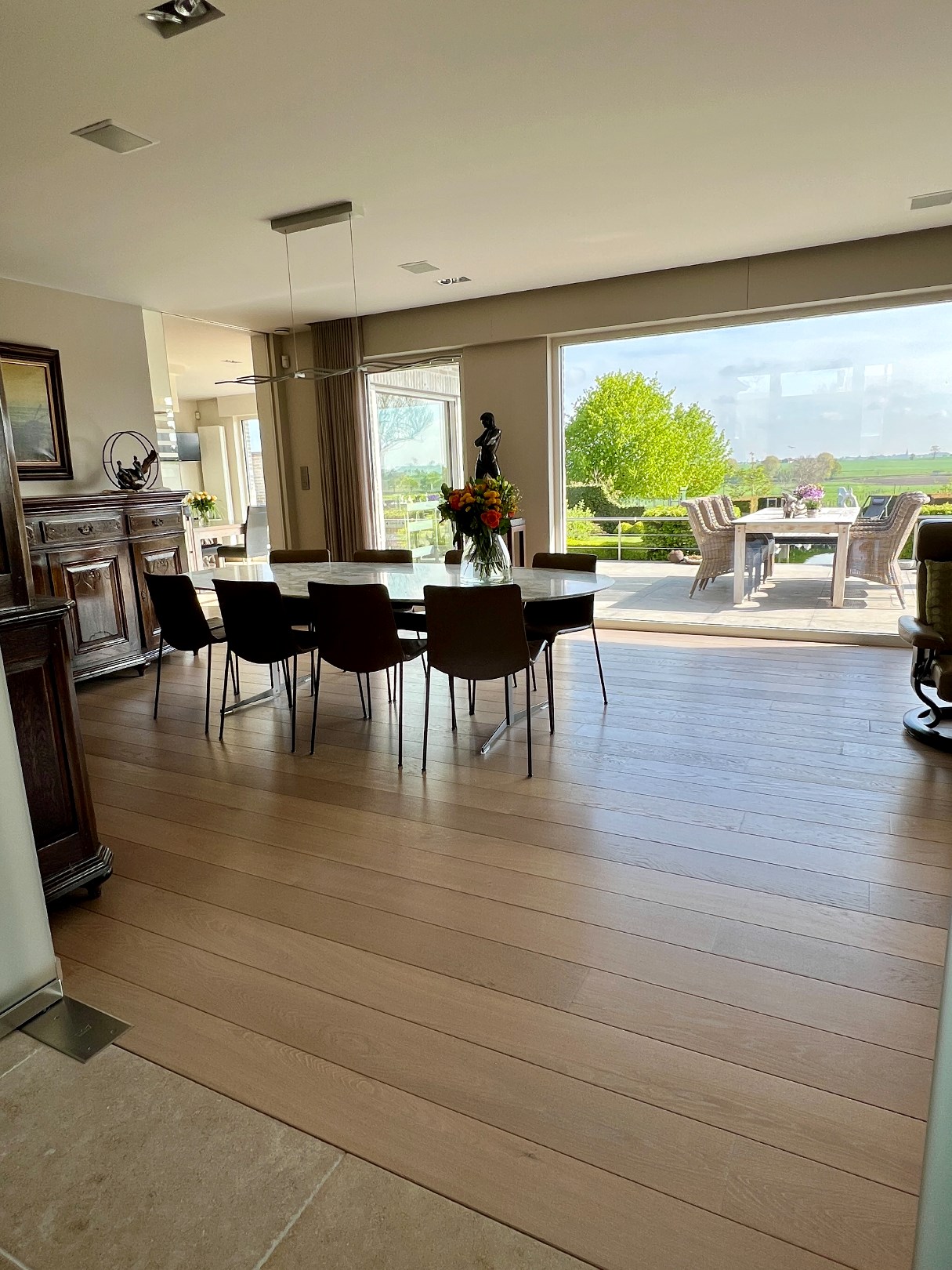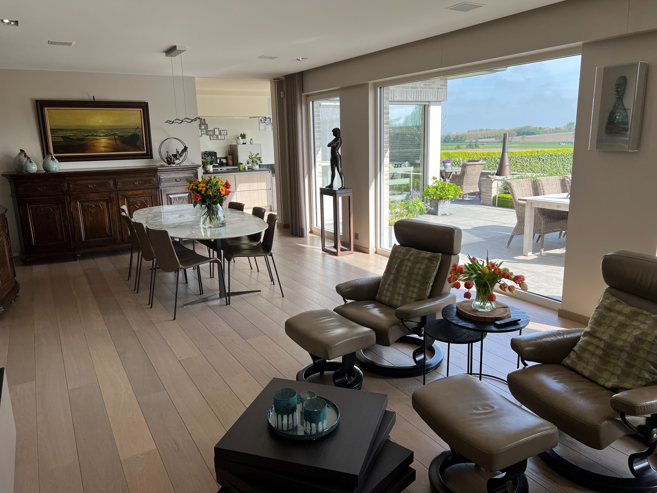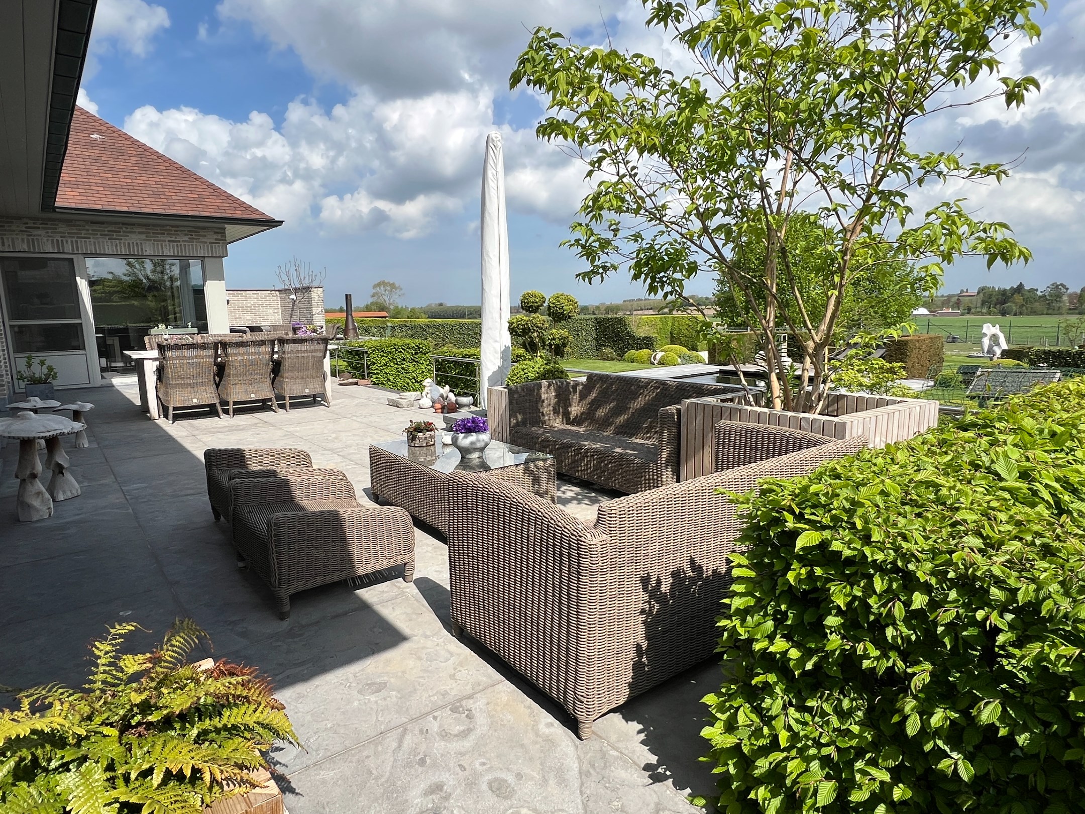 Bij binnenkomst in de woning valt meteen de ruime, lichtrijke woonkamer op. Deze ruimte loopt naadloos over in het zuidwest-georiënteerde terras en de weelderige tuin, wat de perfecte gelegenheid biedt om te genieten van de zon en het buitenleven. De aanwezigheid van een zwemvijver en groene vergezichten maakt het plaatje compleet.