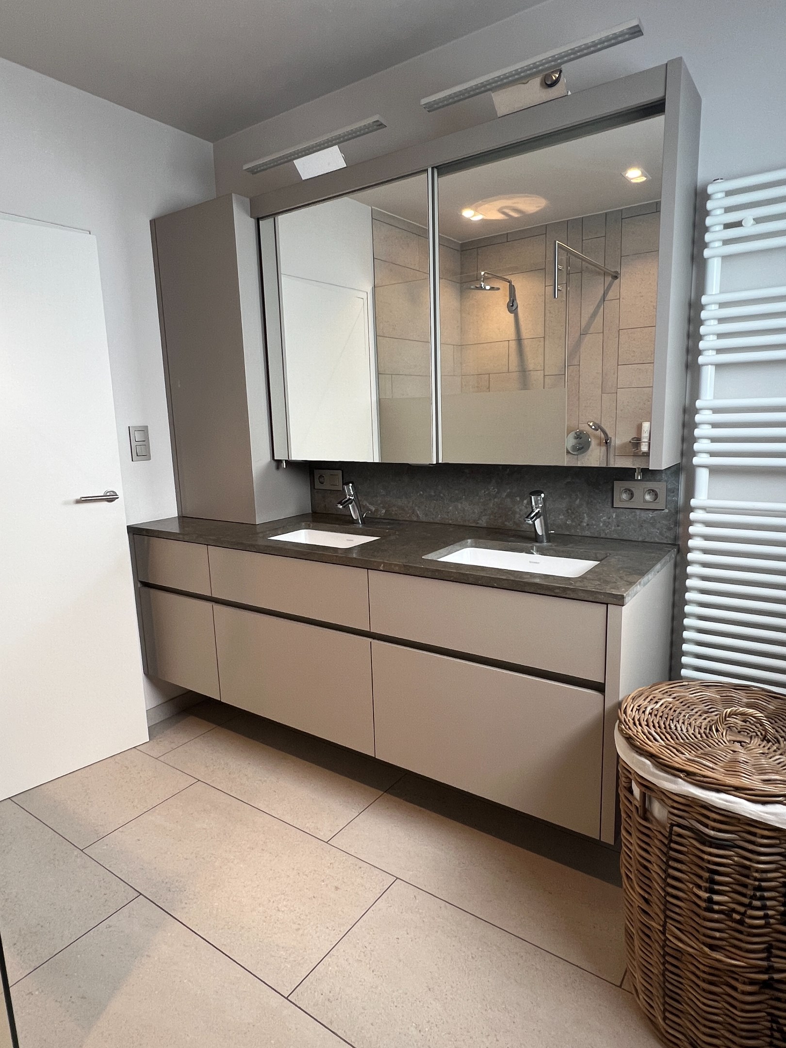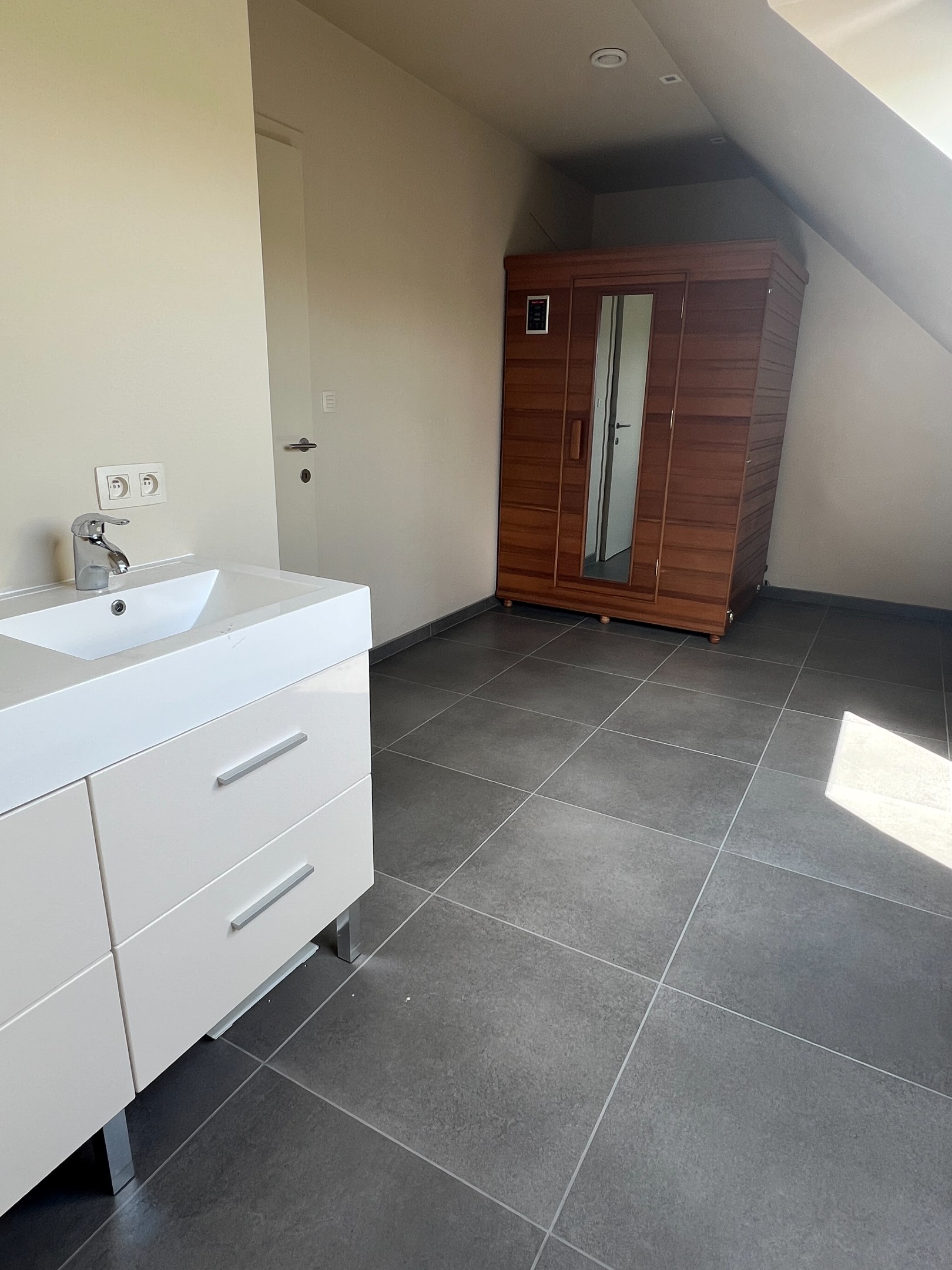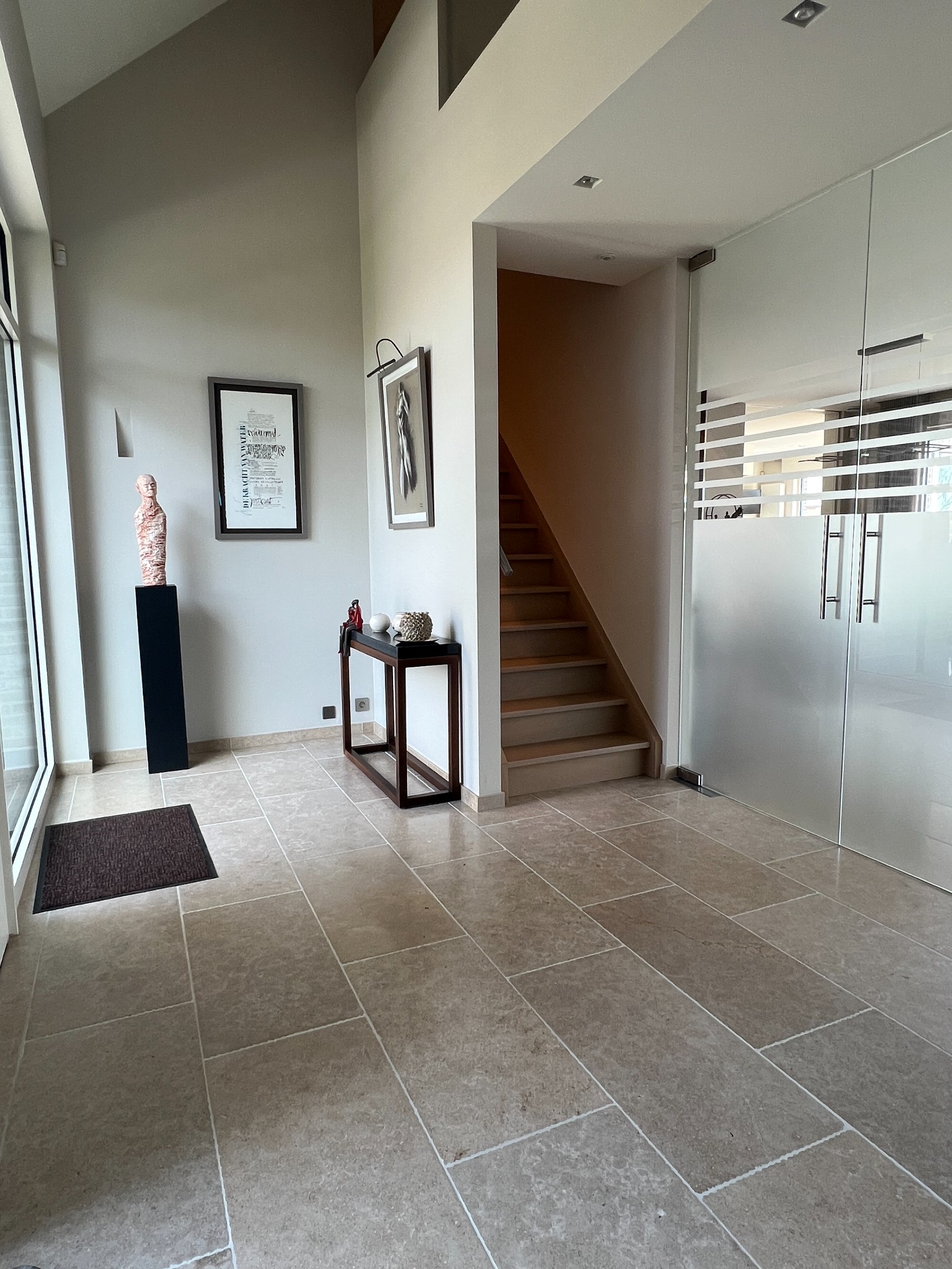 Op de begane grond is er tevens een slaapkamer met dressing, een badkamer met dubbele wastafel, toilet en inloopdouche, alsook een uitnodigende inkomhal met vide en een bezoekerstoilet.