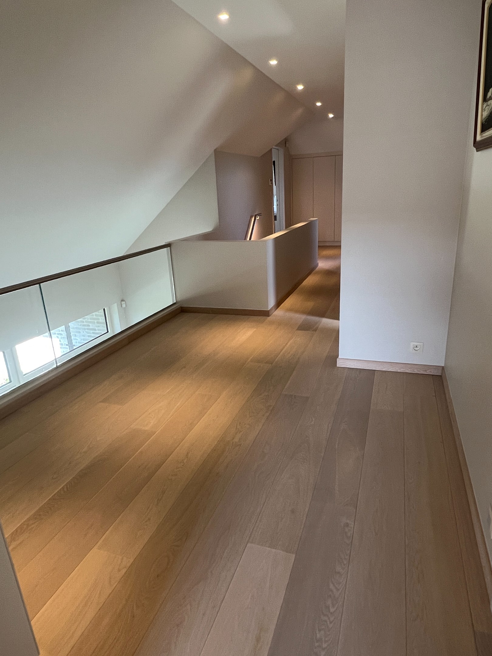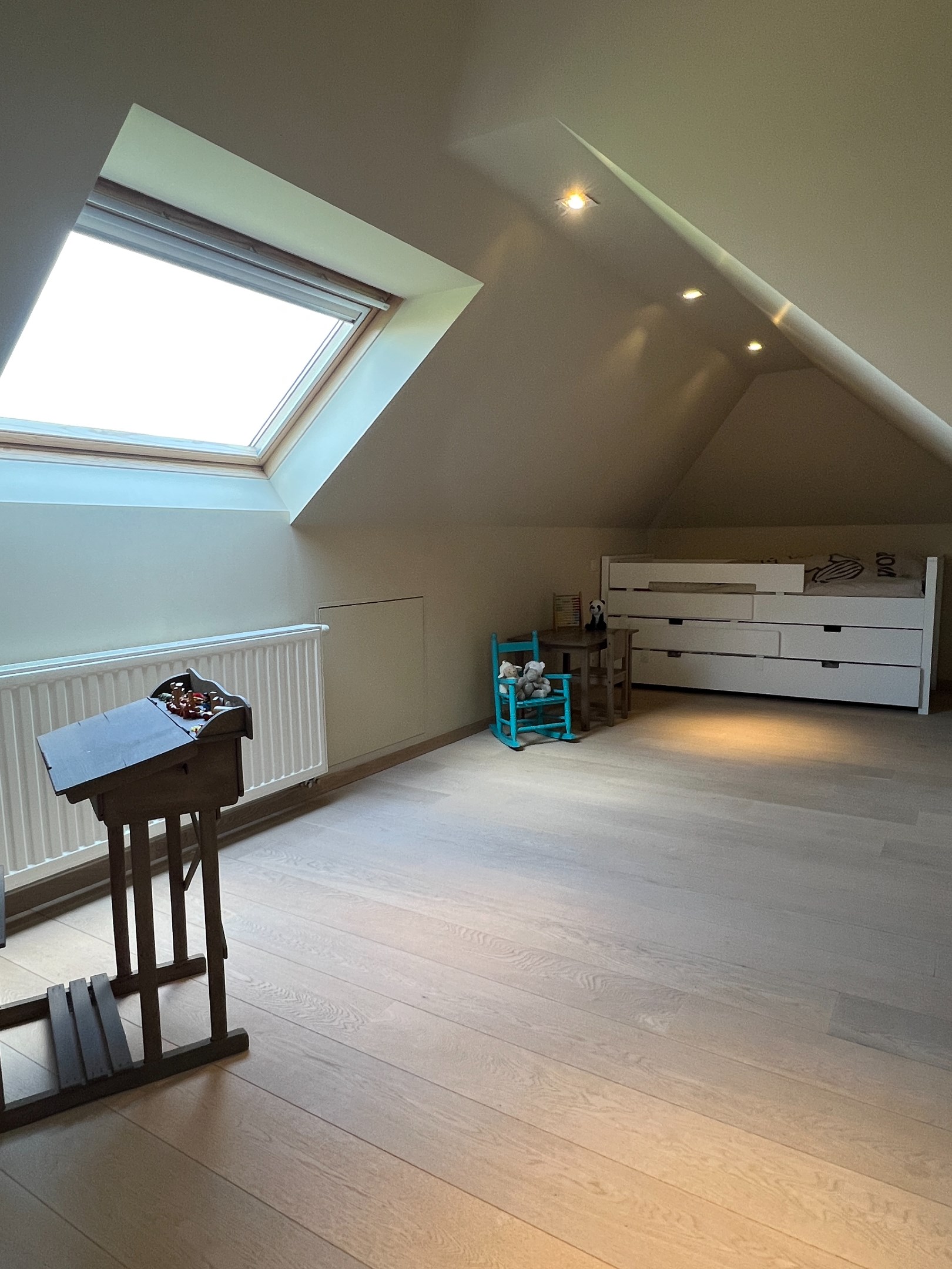 Op de verdieping bevinden zich nog twee slaapkamers, een tweede badkamer, een apart toilet, een aangename nachthal met vide en een kamer die momenteel als ontspanningsruimte wordt gebruikt. Deze kan eenvoudig worden omgevormd tot een grote vierde slaapkamer of zelfs twee extra kinderkamers.