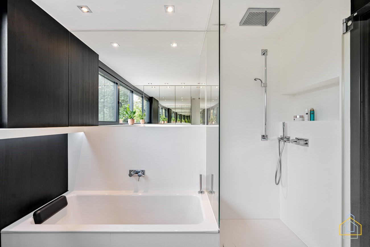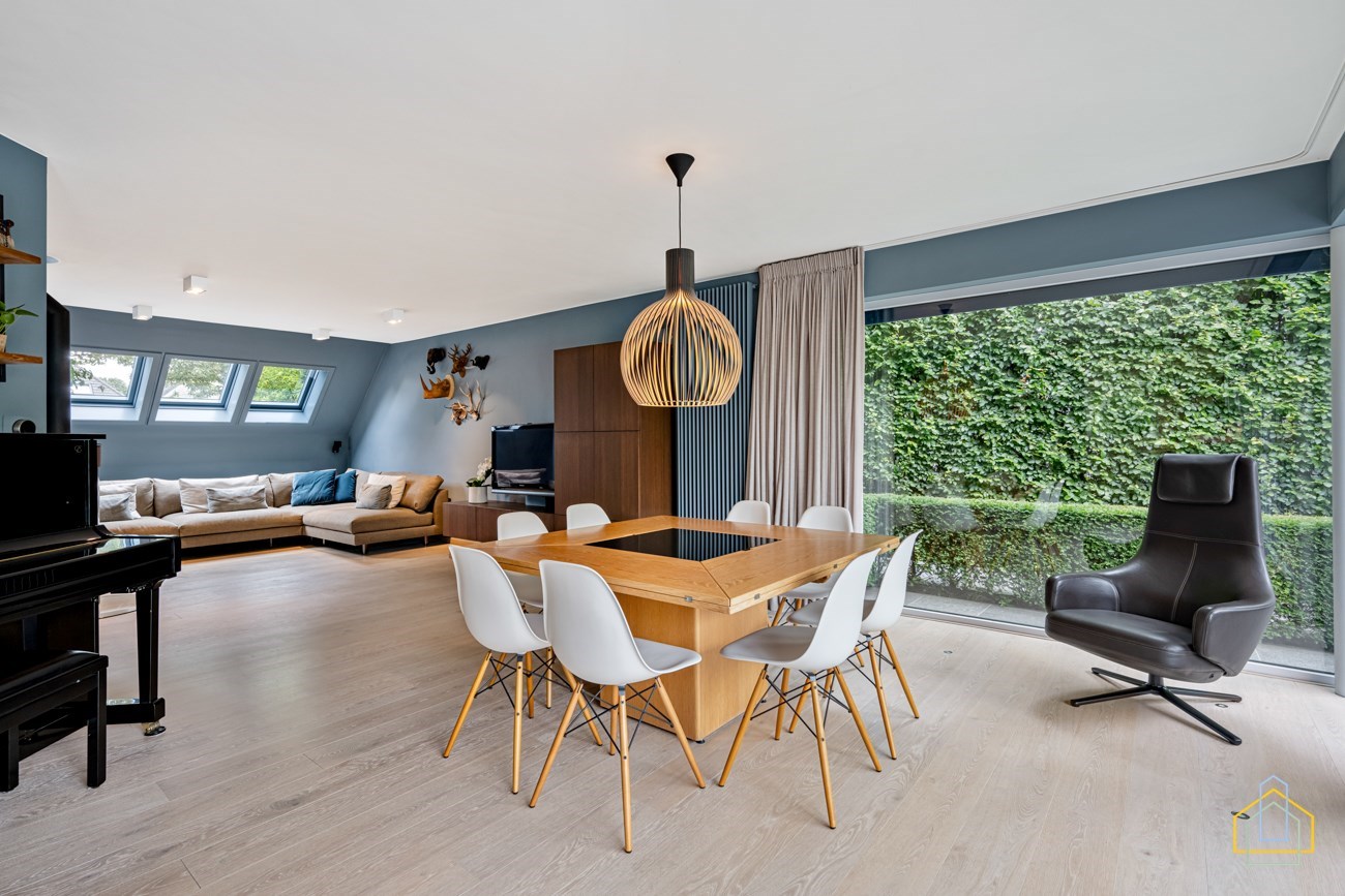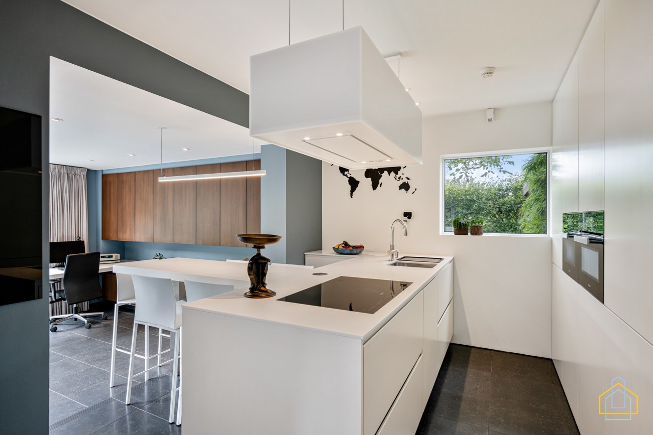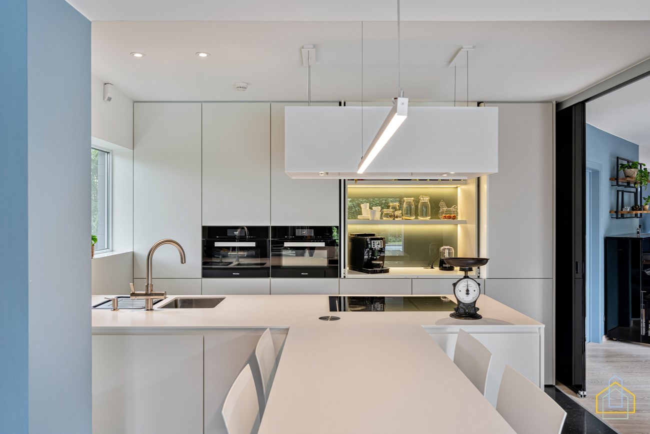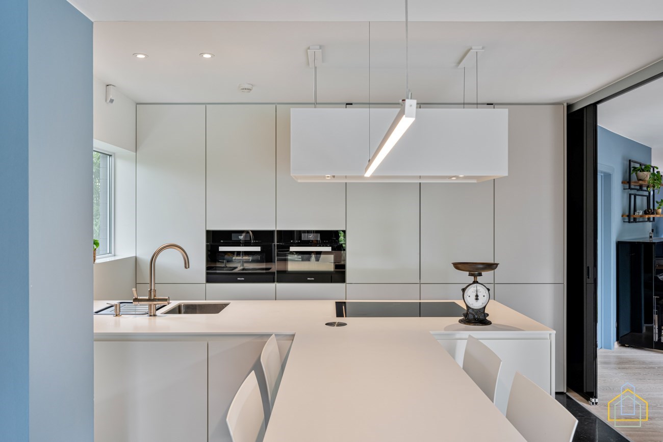 Vanuit de huiskamer loopt u door naar de leefkeuken met strak design. Voorzien van alle toebehoren voorziet zij in aangename kookmomenten door o.a. het corian werkblad, ingewerkte Miele toestellen, 2 combi-ovens, soft close kastsysteem, de slimme opbergkast, de indirecte LED verlichting, plintverwarming en de praktische eet/ontbijthoek.