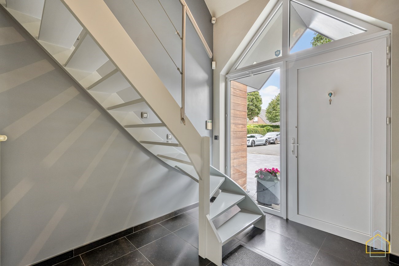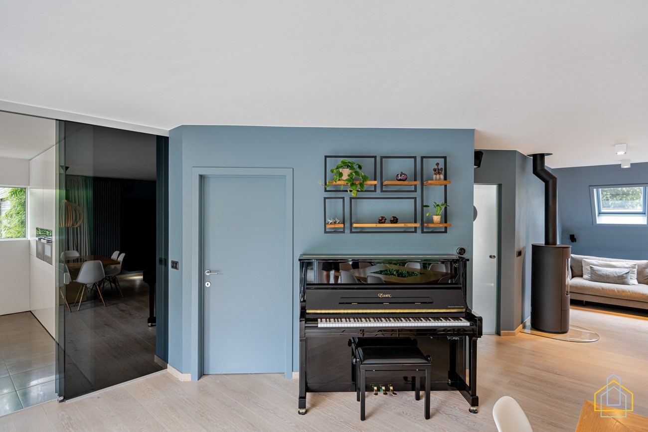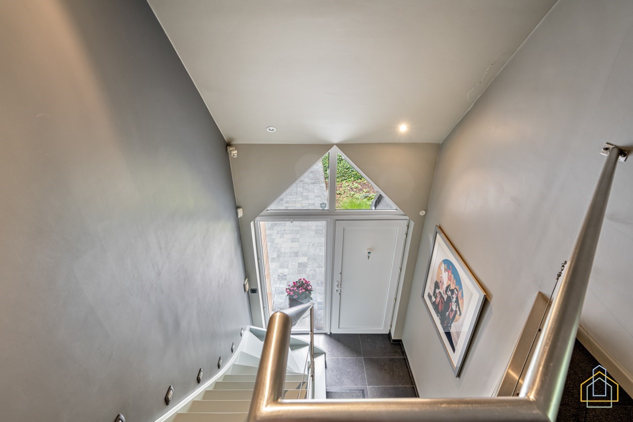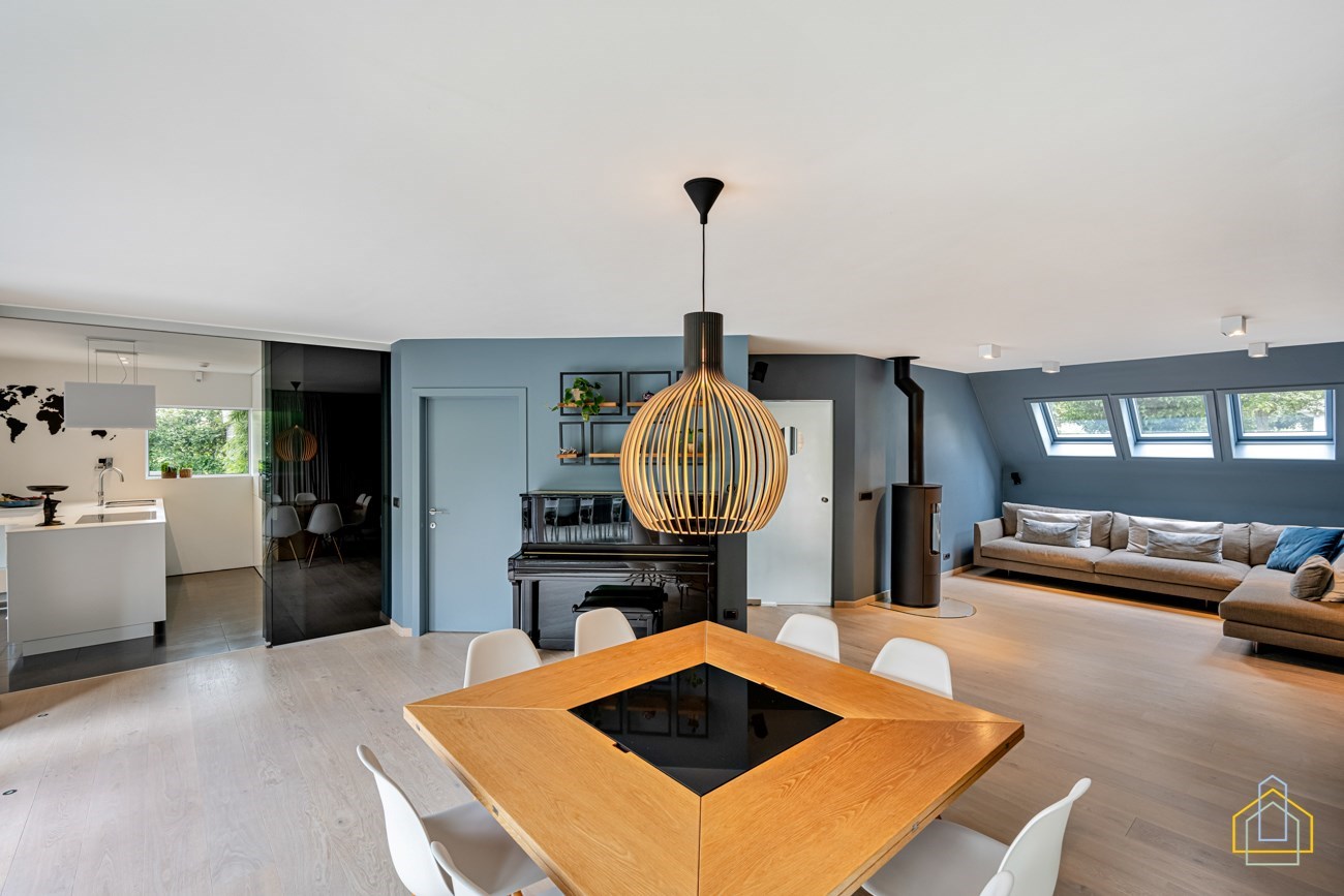 De ruime inkomhal zet de 1ste toon. Met zijn innemende vide wordt u geleid tot het gastentoilet en de leefruimtes. U komt terecht in de lichtrijke woon- en eetkamer met geïnstalleerde keuken die in elkaar doorvloeien, maar alsook van elkaar kunnen gescheiden worden.