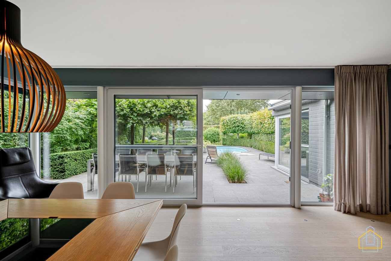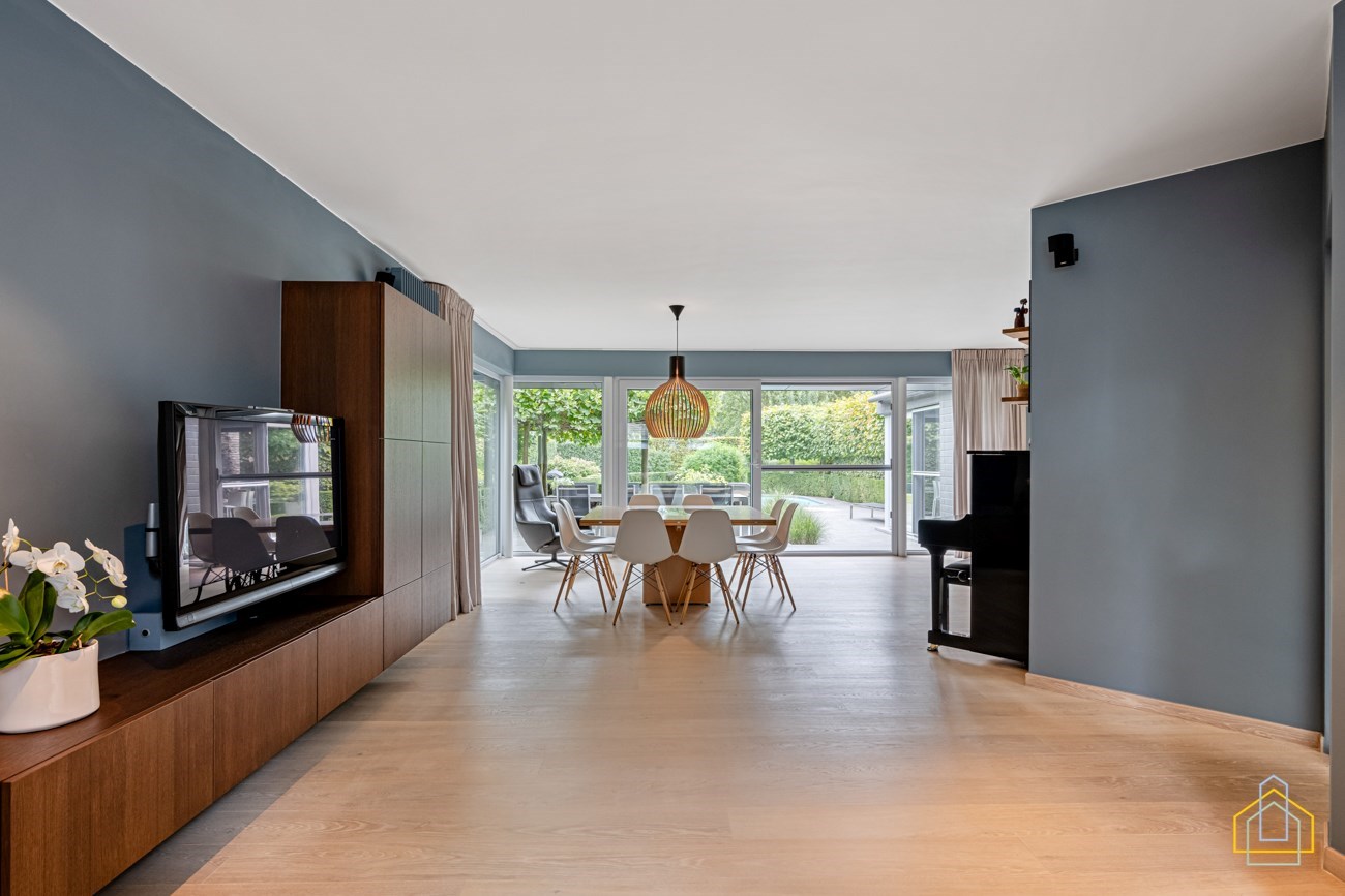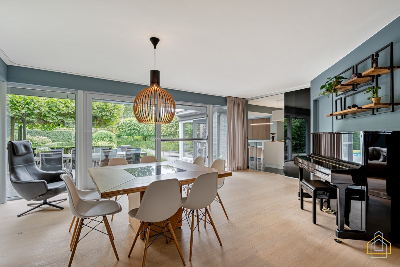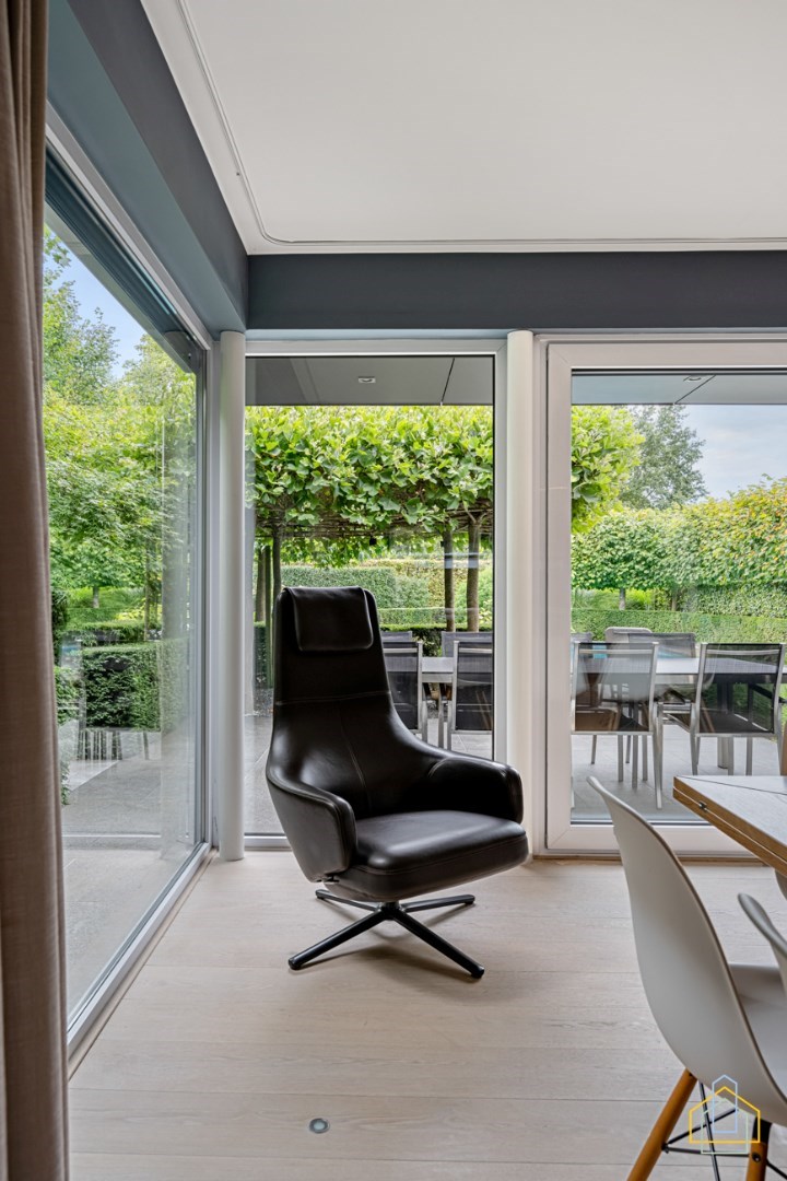 Met zijn grote raampartijen wordt er hier tal van licht binnengetrokken die tevens ook zorgen voor het mooie uitzicht op de fraai aangelegde tuin met toebehoren waar we straks op terugkomen.